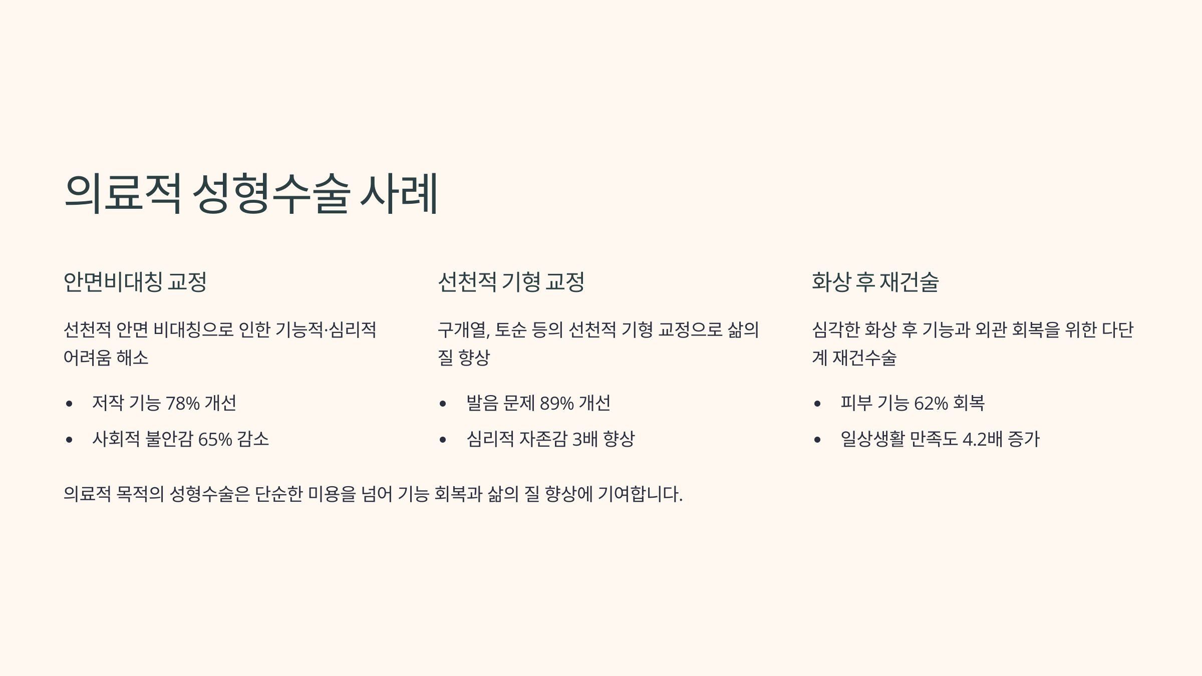 의료 성형은 단순한 미용 목적이 아니라, 삶의 기능을 회복하거나 건강을 위한 경우가 많아요. 특히 비대칭 얼굴이나 선천성 기형, 외상 후 손상 등은 실제 의료적인 필요에 의해 수술이 이뤄지기도 해요. 🧑⚕️