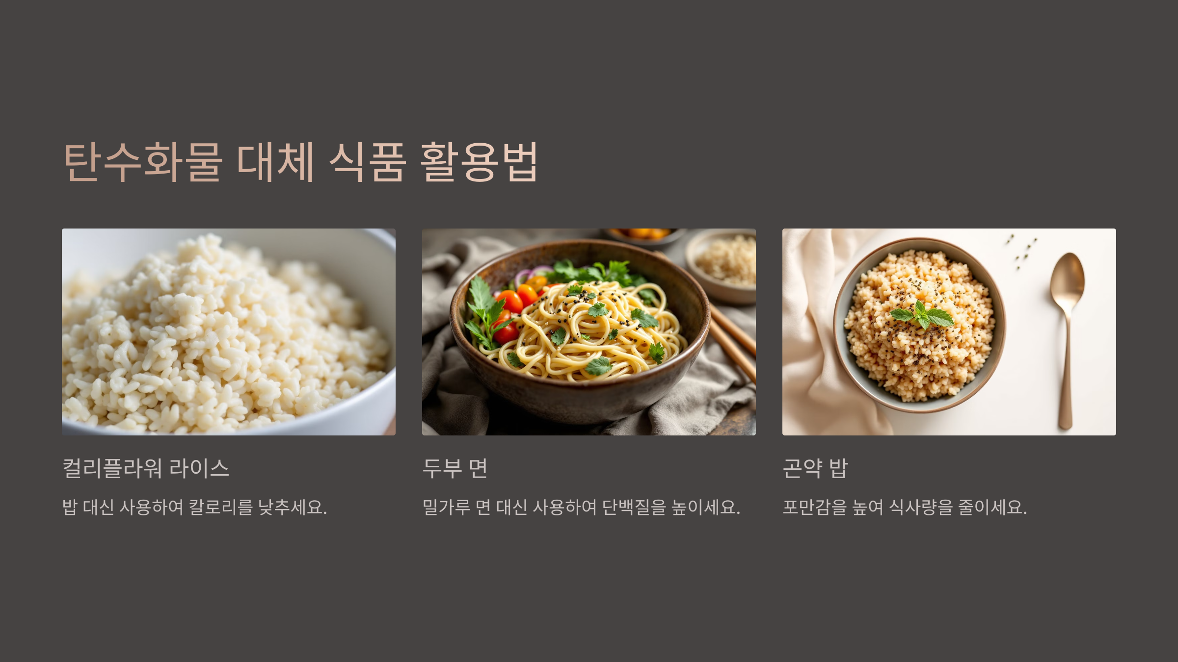 🔽 다음 섹션에서 탄수화물 대신 활용할 수 있는 대체 식품을 알아볼까요?