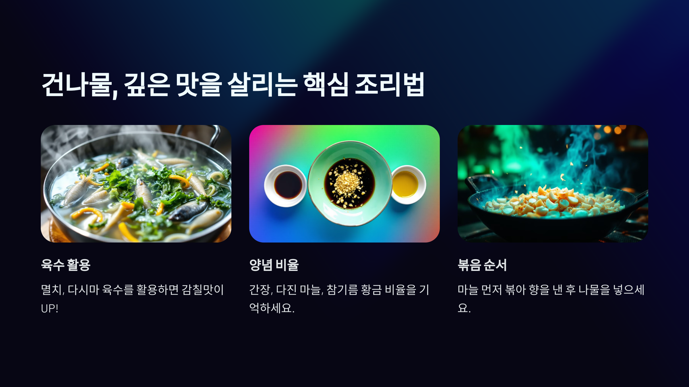 건나물은 조리법에 따라 완전히 다른 맛을 낼 수 있어요. 같은 재료라도 불리는 방법, 볶는 시간, 양념의 종류에 따라 맛과 향이 달라지죠. 깊은 맛을 살리기 위한 몇 가지 팁을 알려드릴게요. 🍽️
